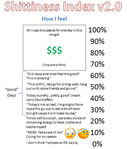 By mid-summer, I decided to retired version 1 of the shittiness index. I realized that I wanted to focus on the positive. So I gave people a guide of how I was feeling.
