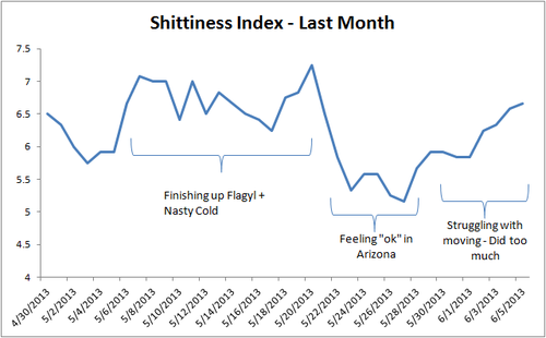 I then started playing with what I came to call the “shittiness index” which was a combination of my fatigue, muscle discomfort and pain. It went over really well with my loving blog followers.