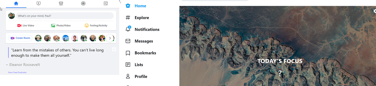 I installed the Facebook newsfeed eradicator several years ago and now barely check Facebook. Part of this is because it’s not all that interesting and I’ve shifted to Twitter where I can control the information a lot better. Regardless, I also run a feed blocker on Twitter and actively add words to a “mute list” (see privacy settings) of anything that is generating high levels of outrage (most political names and divisive issues are a good starting point). In addition, I highly recommend unfollowing large media company sites like CNN, Fox, MSNBC, and so on. They are not in the business of informing people - they are in the business of turning your attention into dollars.