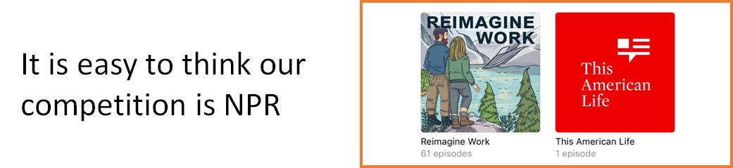 We don’t see stories of the solopreneur like Jarvis who is more focused on “having enough” than getting rich. We think instead in terms of the brands and personalities that capture our attention. If you are thinking about becoming a freelance consultant you worry about competing with Mckinsey and BCG. If you are thinking about starting your own thing, you think about Gary Vaynerchuk and Tim Ferriss. If you are thinking about starting a podcast, you are competing with Gimlet and NPR.