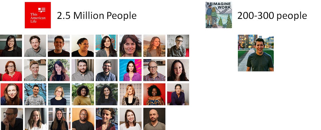 Except This American Life operates like a Fortune 500 business unit instead of a fledgling startup and this is only one of NPR’s many podcasts. Let’s take a look at their team compared to mine and the number of listeners.