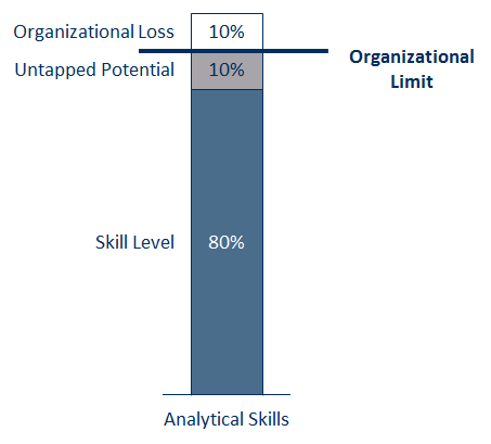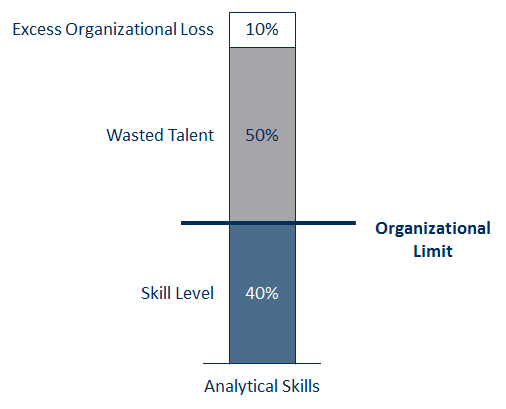 Consider the same person who has the ability to improve up to a 90% proficiency in analytical skills — this organization can only take advantage of any skill level up to 40% proficiency. This same person doesn’t have room to grow any more — they are limited by the talent-organizational fit. This person should probably look for a new job that better aligns with their skills
