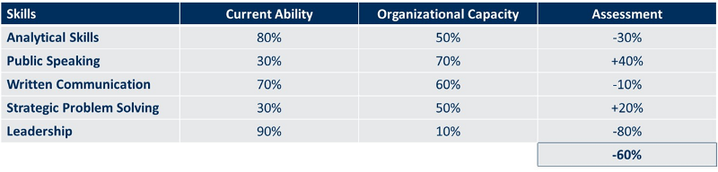 To take stock of your current skill-organization fit, try to take a step back and assess yourself on the skills where you are strong or where you want to improve and develop. Next assess the organizational capacity — basically an estimate of whether these skills are valued or not and if they are able to support the best of the best in these areas.As you can see in the above chart — the person’s organization is not taking advantage of their above average leadership, written communication and analytical skills. However, there is still room to grow in public speaking and problem solving. Depending on where you see your career going and which skills you want to develop, you need to think about whether staying at your current organization is doing more harm than good.