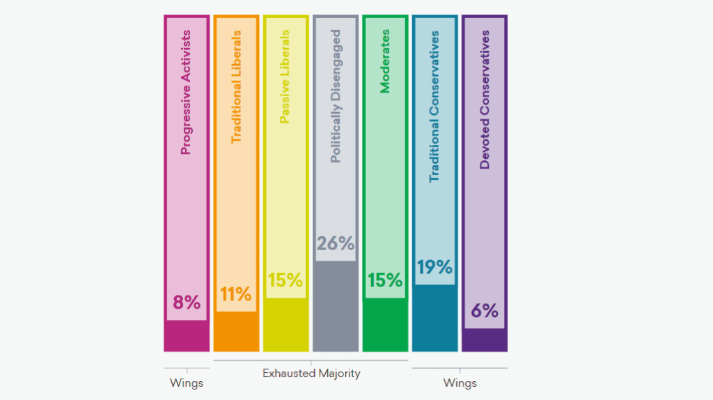 In 2018, the “Hidden Tribes” report helped to add some nuance to the polarization meme that seemed to be accepted as gospel. They found that four divisive issues “divided” America but that 67% of the public could be described as an “exhausted majority”