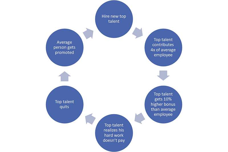 Research findings from Ernest O’Boyle and Herman Aguinis should have rocked the corporate world in 2012. Instead, it was business as usual. Google, however, was one company that took notice. O’Boyle and Aguinis found that in a number of different fields, human performance followed the power law distribution rather than a normal distribution. This means that in most corporations, there are a small amount of people contributing the bulk of the results rather than a larger band of people with slightly varying degrees of performance. The conventional wisdom of the normal distribution coupled with conventional pay practices can lead companies to create a vicious talent cycle, especially at the lowest levels of the company. Picture a highly talented new employee getting hired into a company. They complete 24 projects per year, while the average employee completes six. To reward the top talent, that person gets 10% higher compensation at year end. They are satisfied for now, but start to look towards next year and realize that even if they are much much more efficient and effective than their colleague they know there is not much upside to working so hard.The choice becomes between mailing it in and putting it on cruise control or quitting. As I’ve seen over and over again, the talented employee ends up leaving. Even more, the average person, due to their tenure and the companies commitment to promotions on a time-based cycle gets promoted. The new top talent they hire is going to be even more frustrated than the last person. The cycle repeats until the company is full of average people and the company hires a consultant to figure out why it is not successful anymore. Companies need to take a step back and stop looking at metrics like attrition and ask themselves instead “are the right people staying?” and “are the right people leaving?”